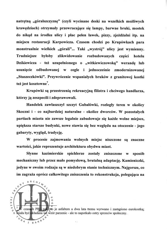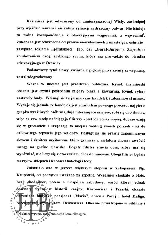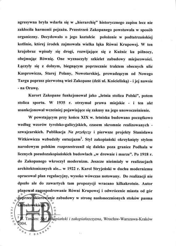 J. Tur, B. Tondos, Skazy na perłach – Zakopane i Kazimierz Dolny pod ciężarem sławy, w: Stare miasteczka w nowych czasach. Ochrona zespołów staromiejskich a turystyka masowa. Kazimierz - miasto zagrożone. Materiały z konferencji naukowej, Kazimierz Dolny, 30 listopada- 1 grudnia 2006, red. Szmygin, Warszawa 2007, s. 91-106.
