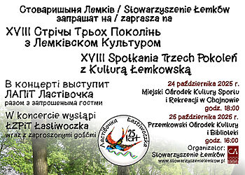 Приносиме вам сумар медияльной ґрупы ЛЕМ.фм+ на ден 24. жолтня/октобра 2025 р. XVIII Стрічы Трьох Поколінь з Лемківском Культуром і 25-літя «Ластівочкы» Уж днес на Нижнім Шлеску зачынают ся 18. Стрічы Трьох...