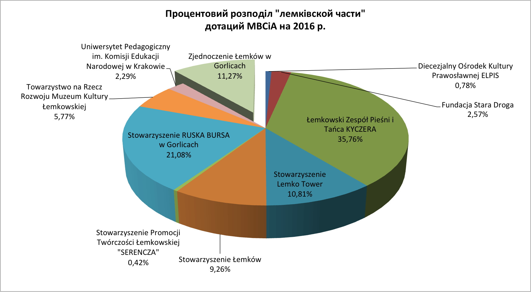 Пониже – процентовий розподіл лемківской части дотаций МВСіА на 2016 р. (выділений кавалец колеса то част, котру достала орґанізация, діюча подля інчых, а часом противных до записів Уставы о меншынах критерий, котры односят ся ґу лемківскій етнічній меншыні).