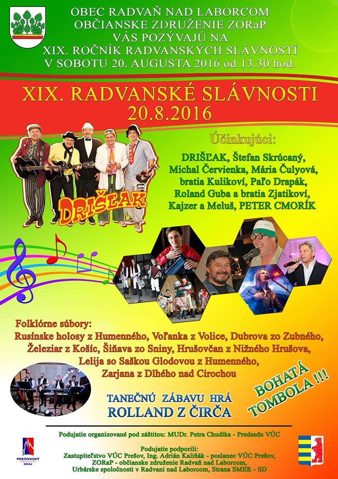 - 20.08.2016 р. (субота) буде проходил 19. Річник Радваньскых Славности, на котрым, окрем фольклорных ансамблів, як напр. Железяр з Кошыц, Русиньскы голосы з Гуменного, вкажут ся артисты з барже модерным ци дискотековым репертуаром: Дрішляк, Пальо Драпак, Ролянд Ґуба і братя Зяткові та інчы;