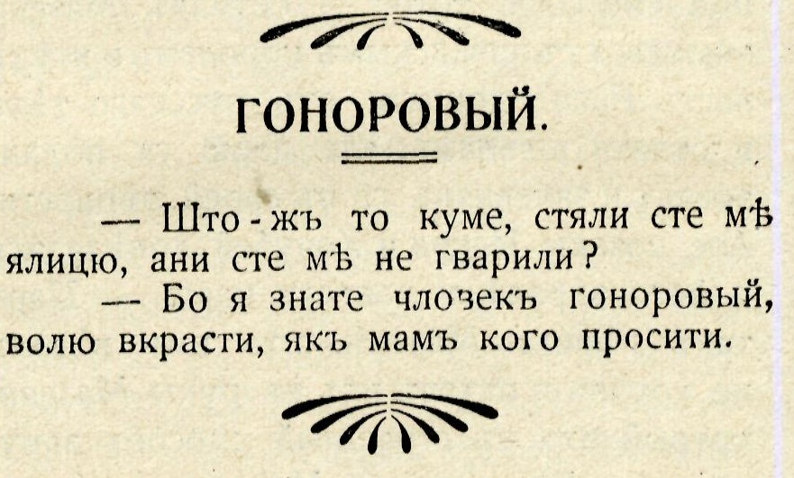 Доказів не было ниякых, лем штоси сме тямили. Знали сме тото, што Лемкы были все гоноровы. А фурт ся вказувало, што давно было як і днес. Не інакше. Лемкы поділены были на высокых і низкых, лысых і пелехатых, богатых і бідных, мудрых і премудрілых. Но і, самособом, на верху стояли провідникы народа. І вшыткы они мали свій гонір. Вшыткы – до єден.