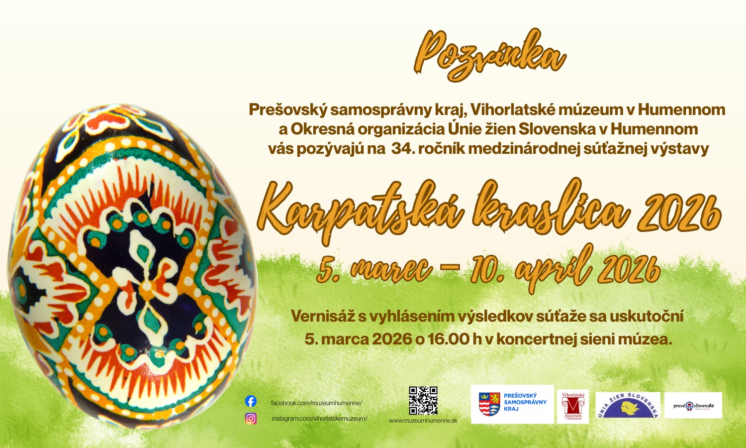 Вігорлатьскый музей в Гуменнім у співпраці із Окреснов орґанізаційов Унії жен Словакії і тот рік зорґанізовав вже 34-ый річник меджінародной конкурзной выставы під назвов Карпатьска писанка 2026.