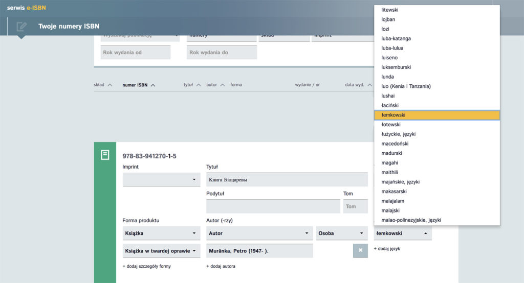 В грудни 2017 р. редакция ЛЕМ.фм зголосила до бюра Задачового Ансамблю дс. знормалізуваных номерів выдавництв ISBN та ISMN потребу додати до опций выбору языка публикаций лемківскій язык. В звязку з тым, же ISBN єст медженародным форматом, рішыня додати язык не залежало лем од польского бюра. Внесок был переданий дале. По пару тыжнях пришла одповід, што од днес, то є од 14. лютого/фебруара 2018 р., лемківскій язык находит ся в базі. Мож го вынайти попри польскым, анґлицкым, німецкым, словацкым і вельох інчых языках, але тіж попри загыбаючых языках ци, здавало бы ся, для нас дакус еґзотичных языках як ачолі, крі, ваі ци мокша.