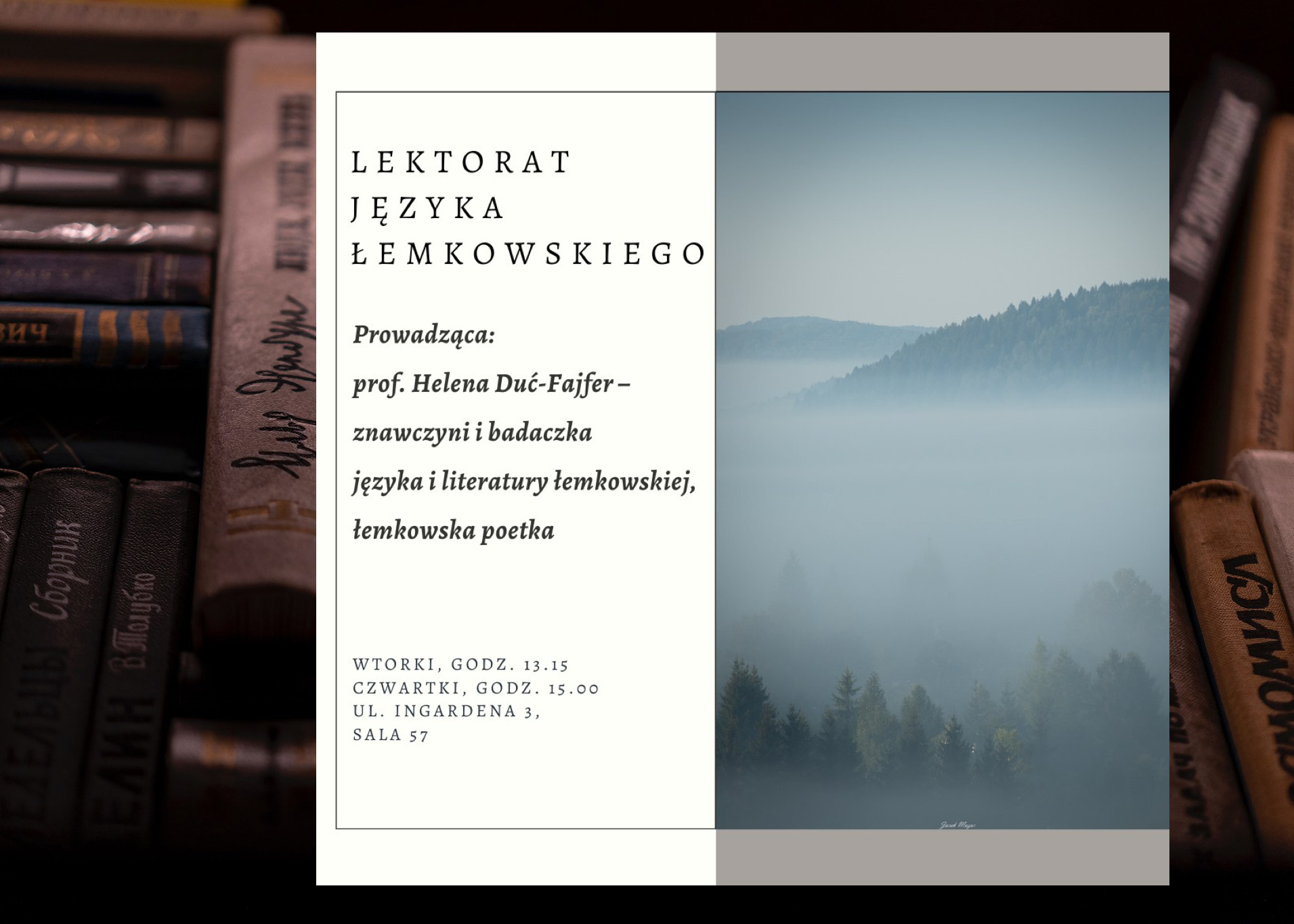 Лекторат лемківского языка веденый буде в Інституті Східньославяньской Філолоґіі ЯУ. Занятя поведе іх думкодавчыня – проф. Дуць-Файфер, яка в своій долголітній науковій працы вельо місця посвячат як раз основам вчыня лемківского языка, ци тіж досконаліня його знаня.