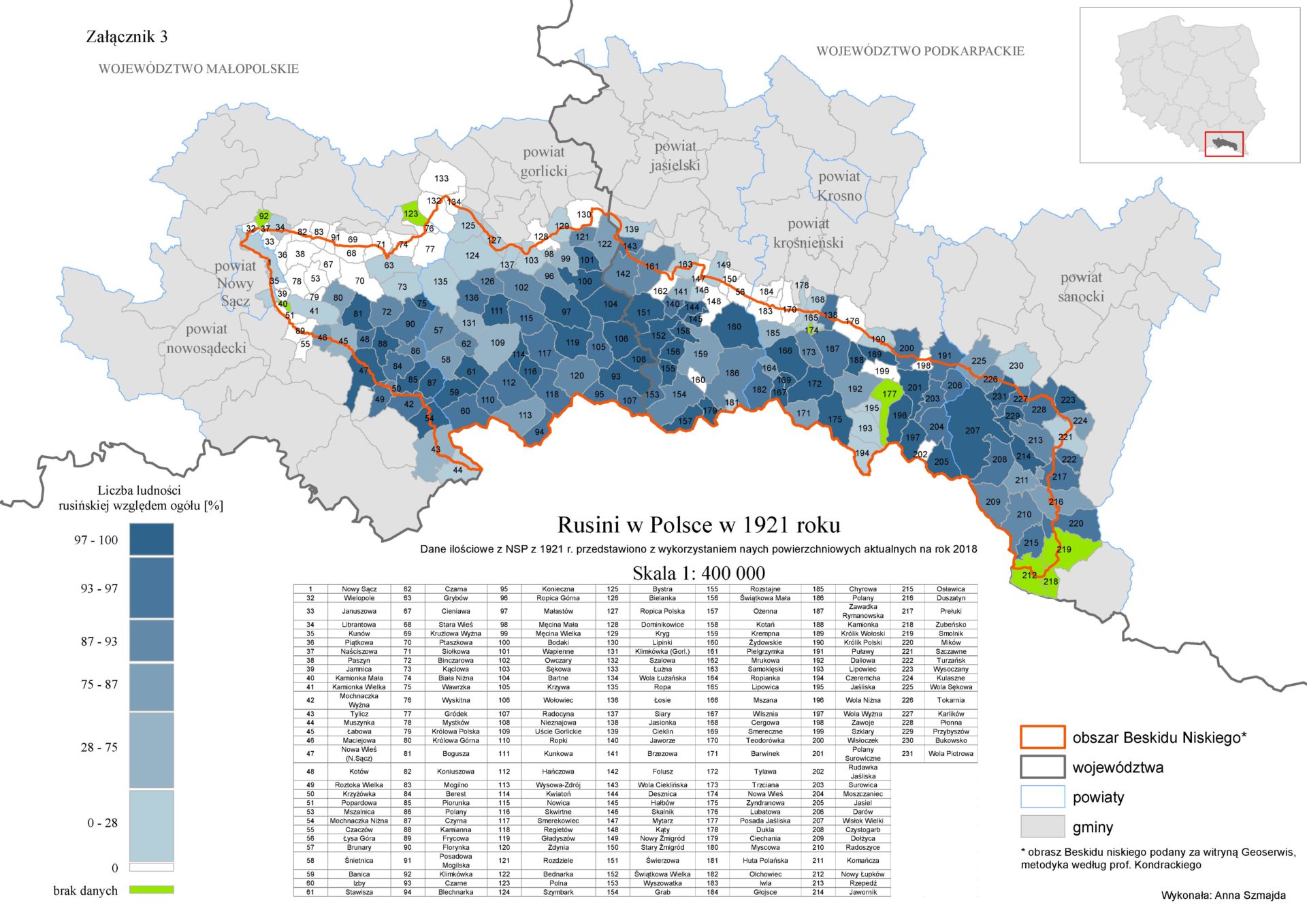 Русины в Польщы в 1921 р. (мапа тыкат ся русиньского населіня лем в Низкым Бескіді)