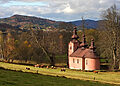 На фотоґрафії: Празьскый метроном, котрый стоїть на місці, де стояв найквешый на світі памятник Сталіна, людми втогды посмішні называный „фронта (шора позн. ред.) на мясо“. Жрідло: Wikipedia.