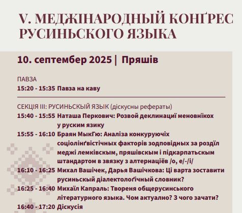 Просиме слухати ретрансмісию з V Медженародного Конґресу Русиньского Языка, якій одбывал ся з днях од 10. до 12. вересня/септембра 2025 р. в Пряшові.