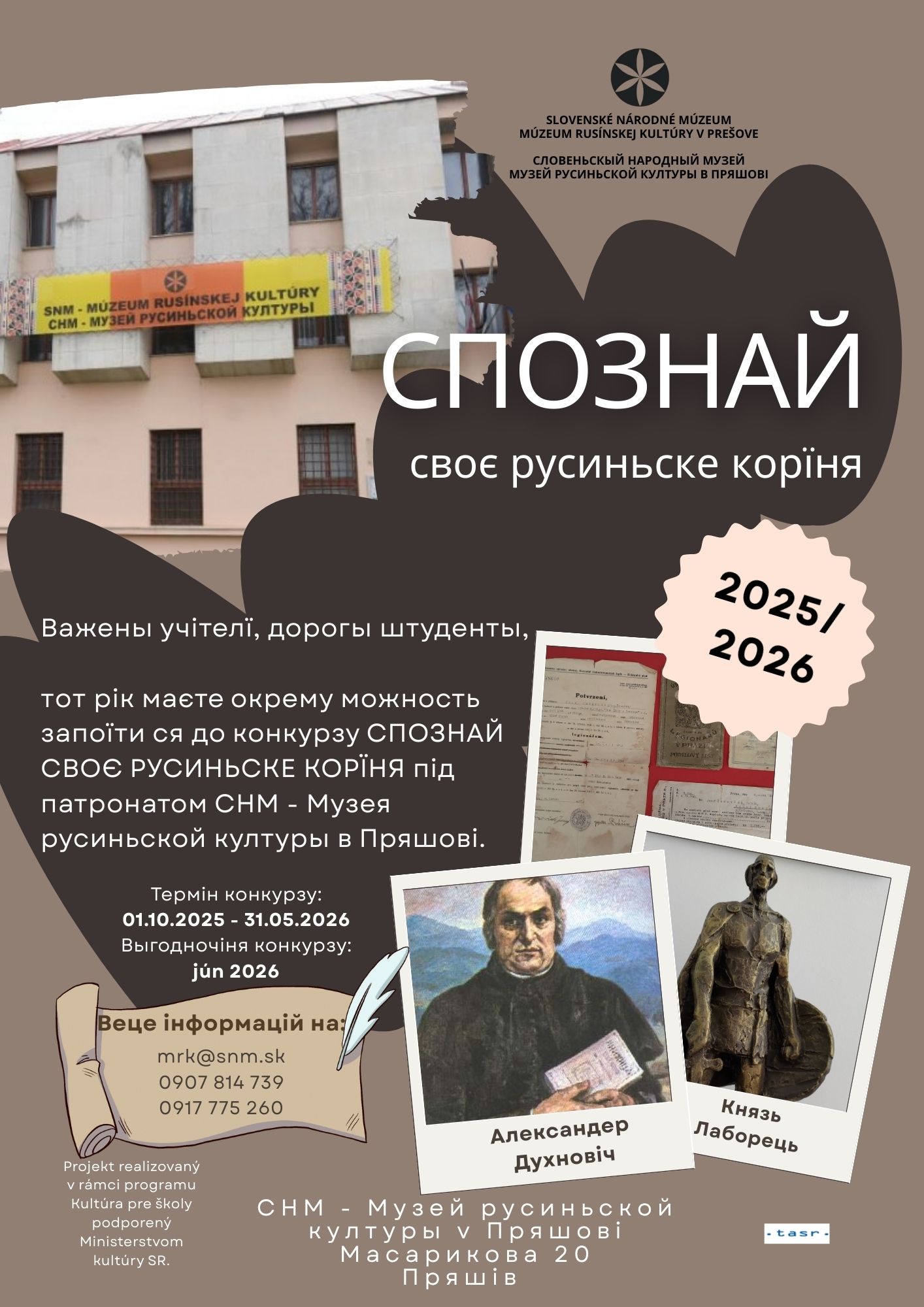 Словацькый народный музей – Музей русиньской културы в Пряшові выголошує історічно-літературный конкурз під назвов Спознай своє русиньске коріня. До конкурзу можуть залучіти ся школярі другого ступня основных школ і штуденты середніх школ.
