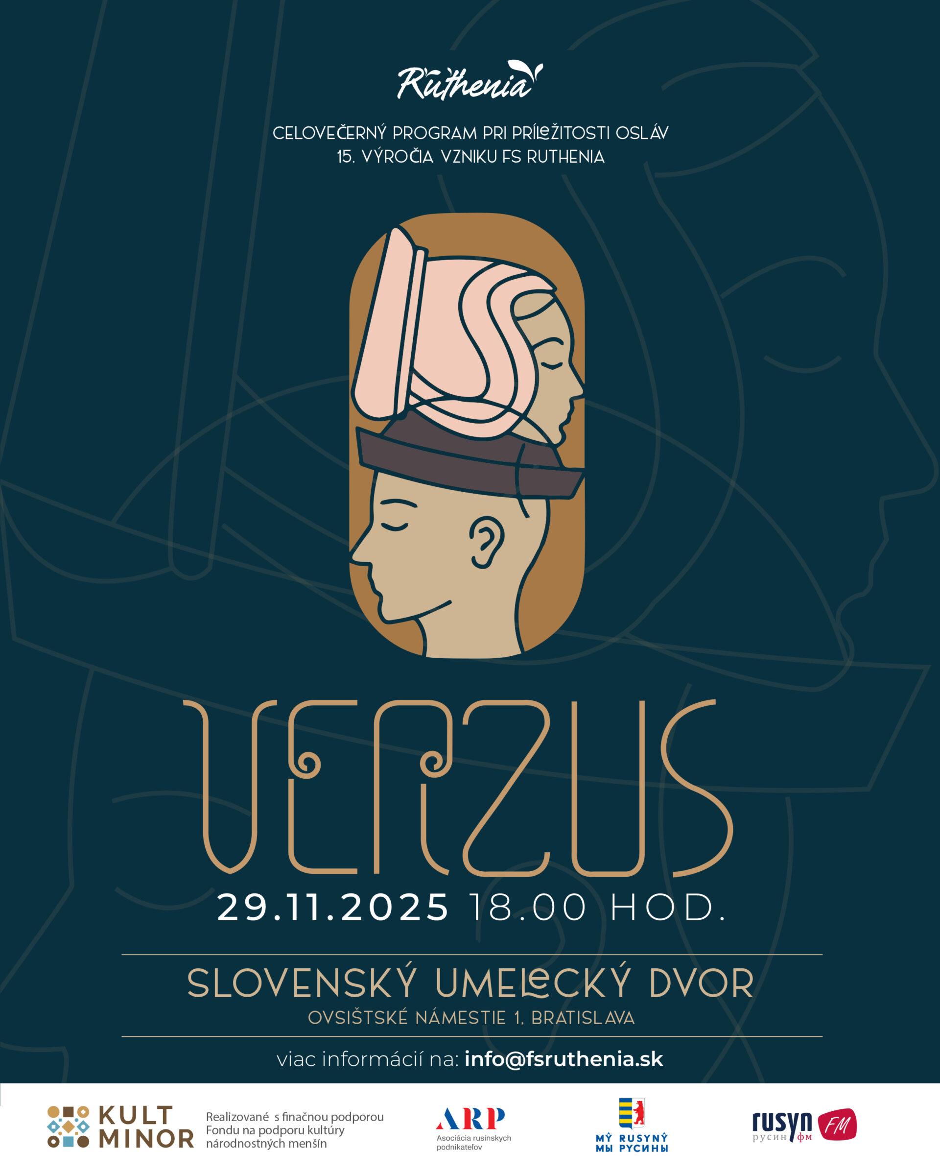 Фолклорный ансамбель Рутенія, котрый діє в столиці Словакії – Братіславі, святкує 15 років од свого выникнутя. При тій нагоді одпремєрує в суботу 29-го новембра 2025-го року в просторах Словацького умелецького двора (Slovenský umelecký dvor) новый ціловечерній проґрам, якый дістав назву Верзус.