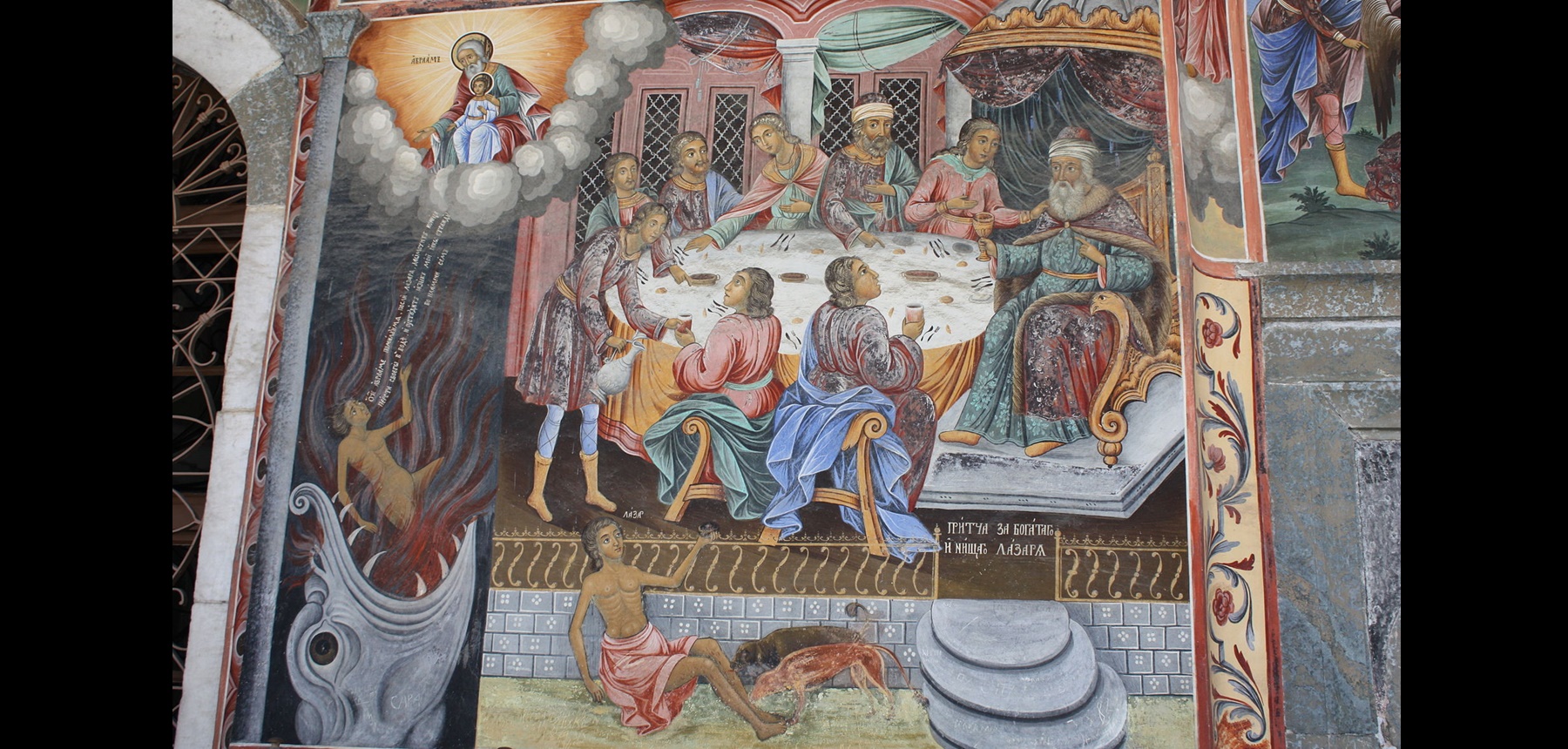 Фото: Лазарь і богач, розпис. Рілскый Монастырь, wikimedia.