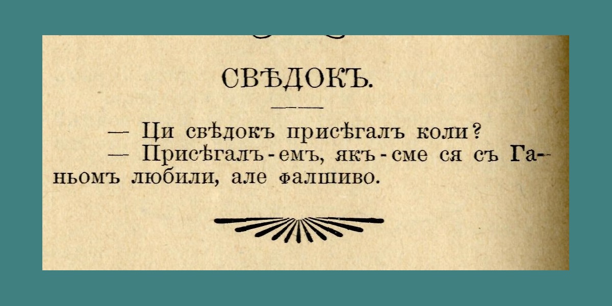 Додаток “сатира, гуморъ, забава” до ґазеты Лемко в ч. 25 за 1912 рік приводит судову моралізаторску сценку нияк не смішну.