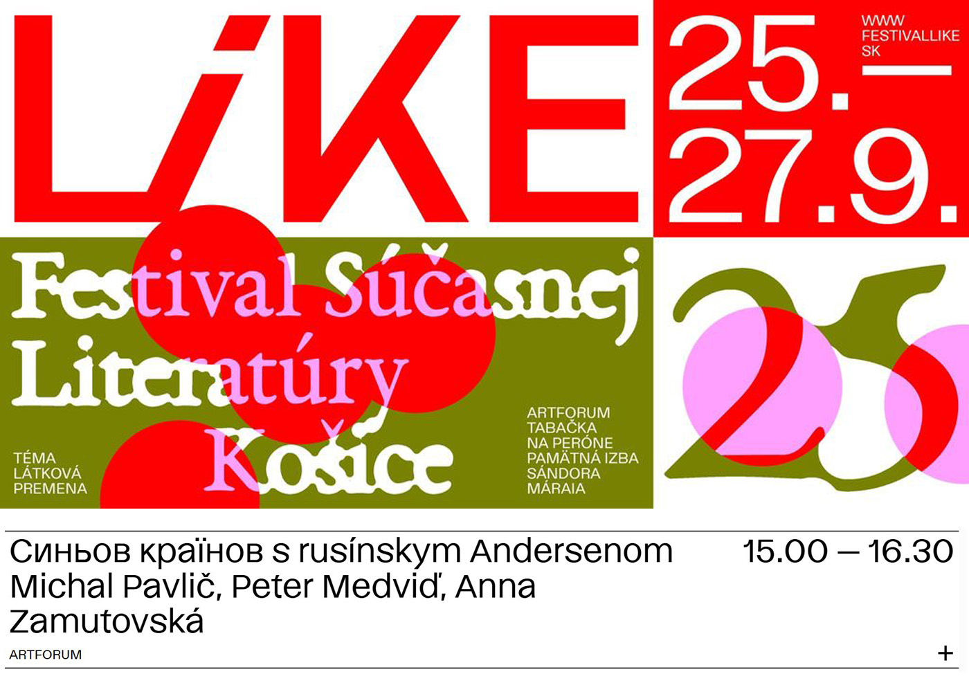 Заран зачынат ся літературный фестіаль в Кошыцях – Фестіваль Сучасной Літературы LIKE 2025. В богатым проґрамі фестівалю своє місце нашла тіж русиньска література. В суботу 27. вересня/септембра о стані сучасной русиньской літературы на Словациі бесідувати будут журналиста і поета Петро Медвідь, дослідник літературы Михал Павлич і активістка Анна Замутовска, а дискусию модерувала буде Леа Васькова, лавреатка Літературной Нагороды ім. Мариі Мальцовской 2024. В часі подіі Петро Медвідь прочытат пару вершів з дебютансткой збіркы «синьов країнов», а Анна Замутовска фраґмент байкы Християна Андерсена в тлумачыню на русиньскій язык, з книжкы печатаной орґанізацийом Молоды.Русины.