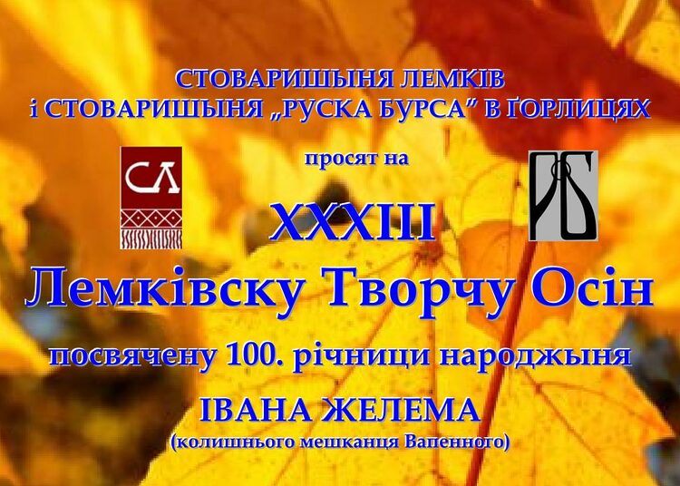 Уж в тот вікенд, 11. і 12. жолтня/октобра, одбуде ся 33. Лемківска Творча Осiн. В тым році подія посвячена єст сотній річници народин Івана Желема – выдатного лемківского поеты і писменника. В суботу Творча Осін буде проходила в Ваппеным, в Здройовым Домі, а в неділю в просторах Руской Бурсы в Ґорлицях. І першого, і другого дня подія зачне ся о 16.00 год. Выступлят творці слова з Польщы і заграниці, а в артистичній части – Ансамбль Терочка і Домініка Новотна з піаністом Петром Адамковичом зо Словациі. Доповід о Івані Желемі выголосит проф. Олена Дуць-Файфер. Стрічы товаришыла буде выстава фотоґрафій Петра Басалыґы. Вступне на обі подіі дармо.