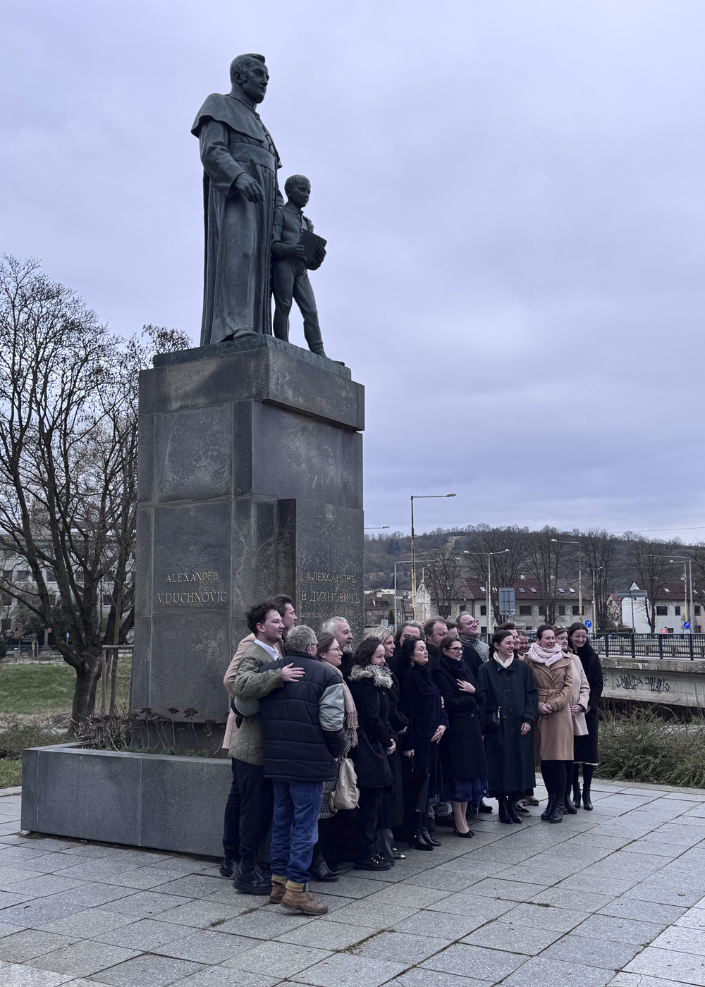 Із Сабінова вертало ся до Пряшова, де акторы і робітници ТАД пішли ку памятнику Александра Духновіча, котрого імя має театер в назві. І там оддали честь будительови положіньом квітя, а так само заспівала ся гімна карпатьскых Русинів на слова Духновіча – Вручаніє.