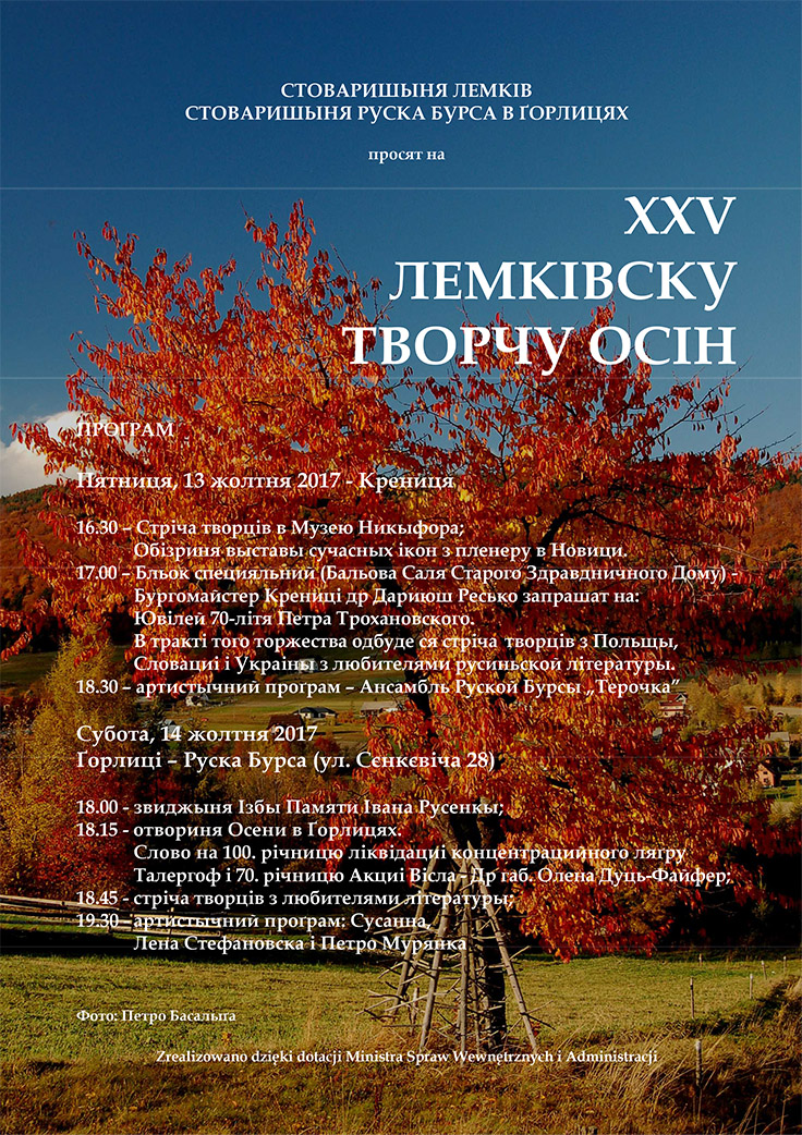 Стоваришыня Лемків разом з партнерами – Стоваришыньом «Руска Бурса» в Ґорлицях та бургомайстром міста Крениця, Дариюшом Реськом, просят на ювілейну 25. Лемківску Творчу Осін. Буде она вынятковом, не лем з причыны ювілею самой подіі, але головні за справом ювілею 70. уродин єдного з найвыдатнійшых лемківскых творців – Петра Трохановского.